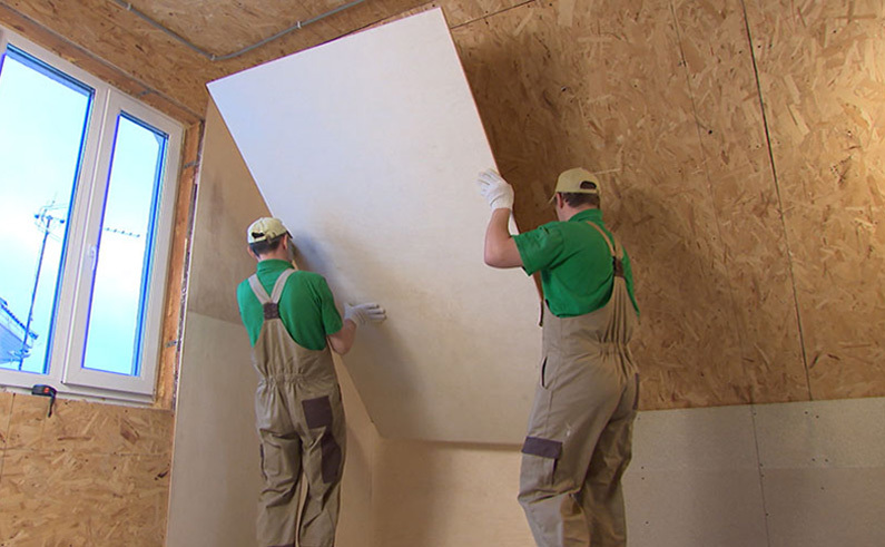 Монтаж на гипсокартон 12,5мм на стени на 2 слоя, няма профил. Монтаж на гипсокартон 9.5мм с профил на тавана, на един слой. Мокри помещения - водоустойчиви гипсови плоскости.